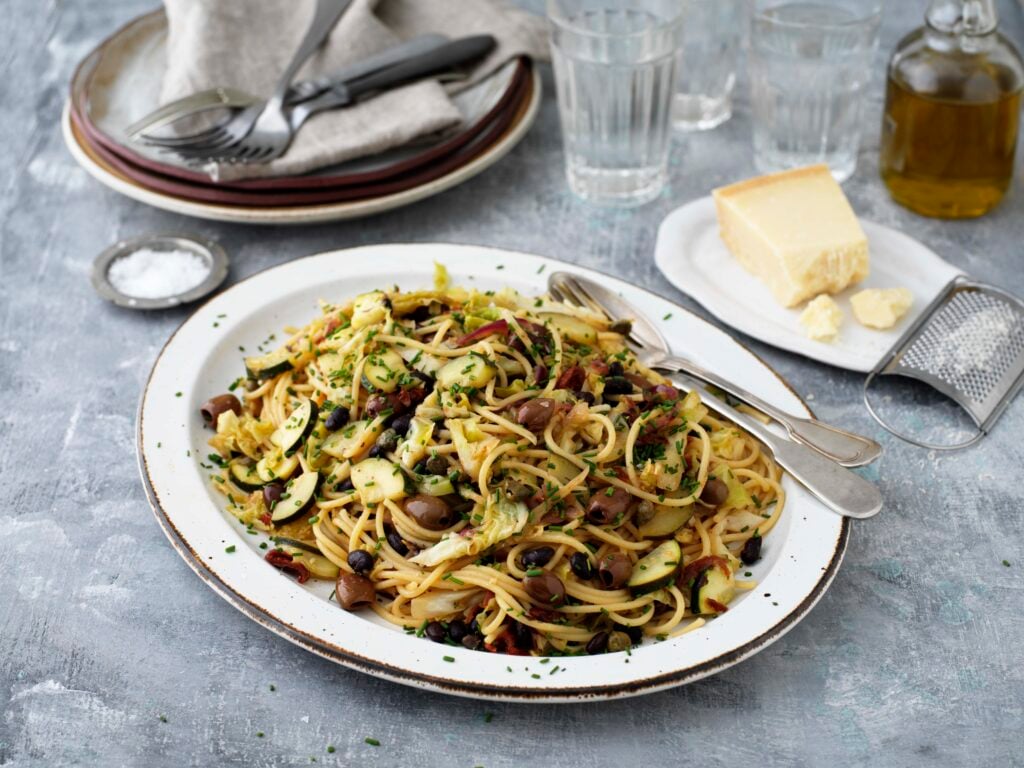 En härligt mustig vegetarisk pastarätt med svarta bönor, oliver och savoykål. Toppas med nyriven parmesan och en smakrik olivolja.