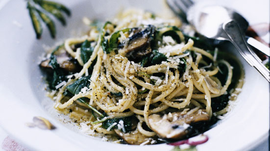 Skogschampinjoner, ruccola och spagetti. Glöm inte att riva Grana Padano eller parmesan över – jättegott!