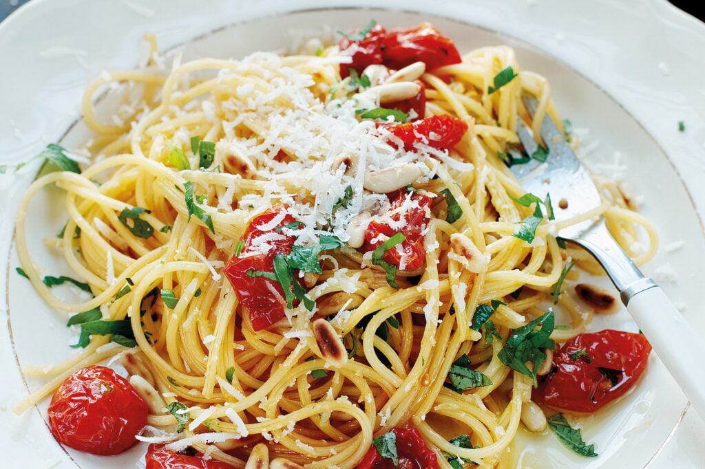 Spaghetti con Pomodorini al forno. Ugnsrostade tomater får en ljuvlig sötma och lyfter denna pastarätt tillsammans med parmesanen och pinjenötter.