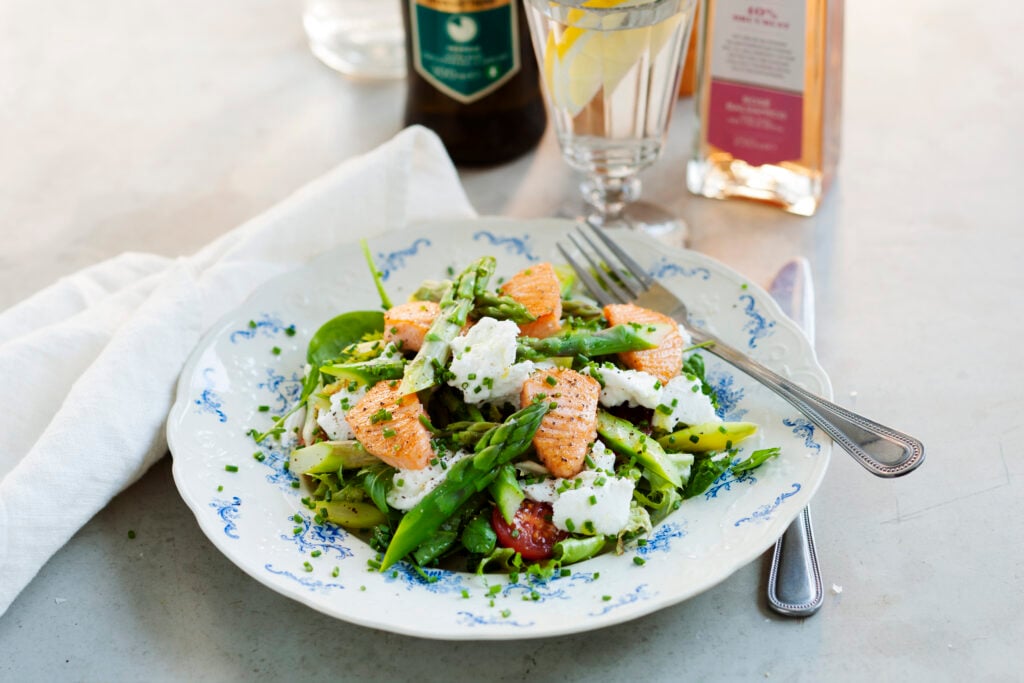 Sallad med nykokt sparris, halstrad lax och krämig buffelmozzarella.