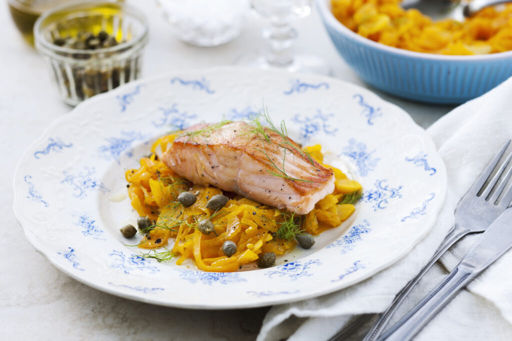 Knaperstekt lax med saffransdoftande fänkål med vitt vin. Passar både till vardag och fest.