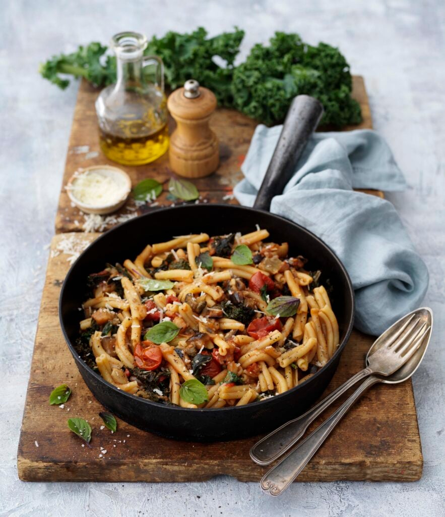 Pasta Strozzapreti med aubergine och grönkål