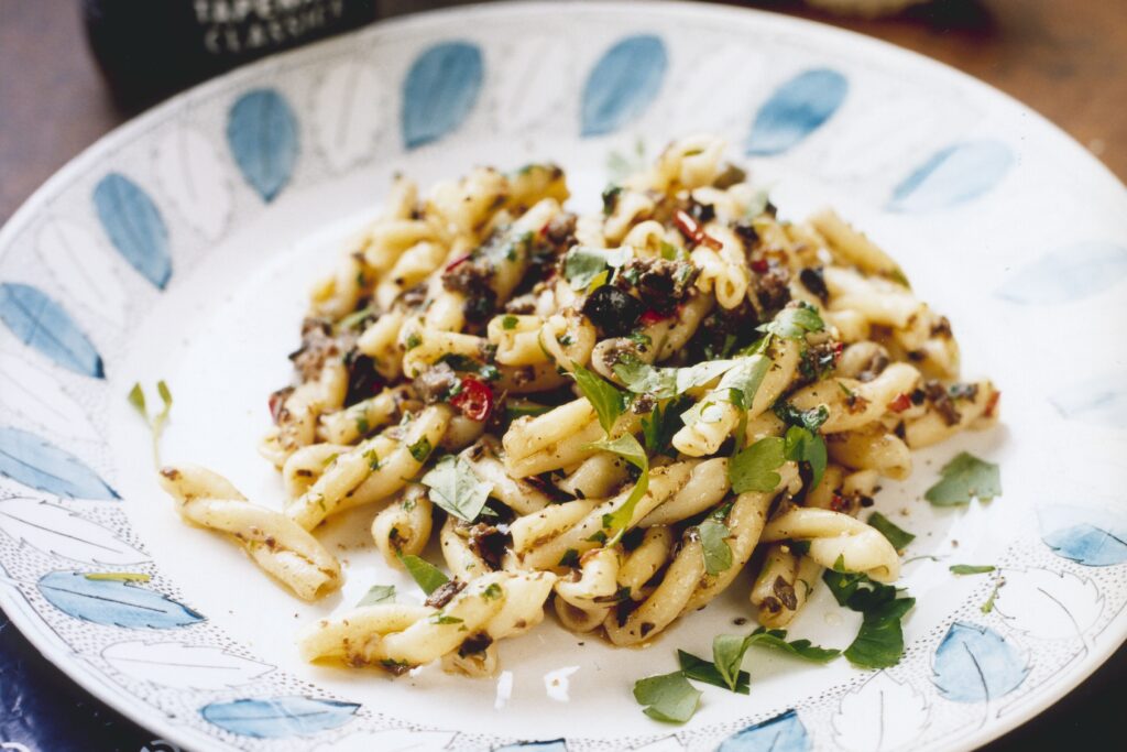 Pasta Strozzapreti med tapenade, chili och persilja