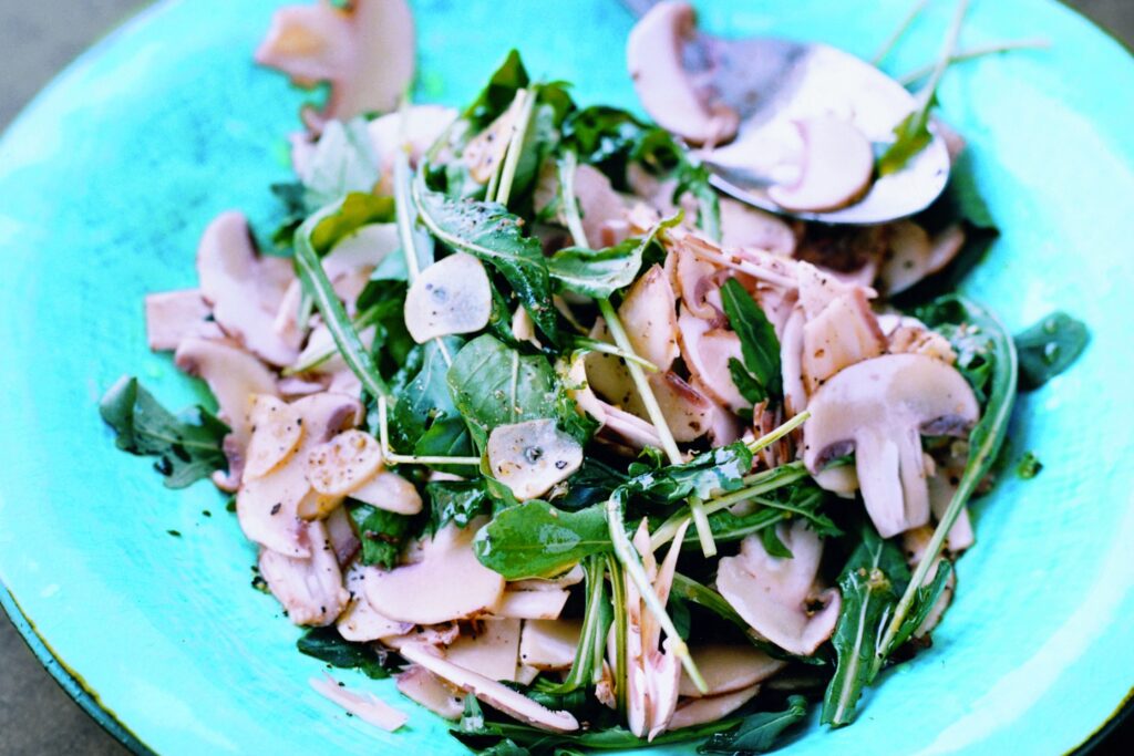 Svamp som hyvlats tunt och blandats med en vinägretten på rostad vitlök och rivet citronskal. Perfekt som tillbehör eller som en förrätt.