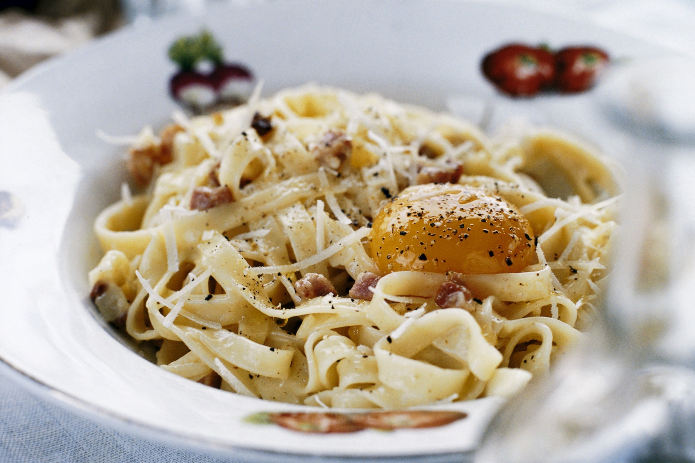 Carbonara med pasta Pappardelle. Pasta carbonara är en klassisk italienskt pastarätt med pancetta och ägg – mycket svartpeppar och parmesanost.