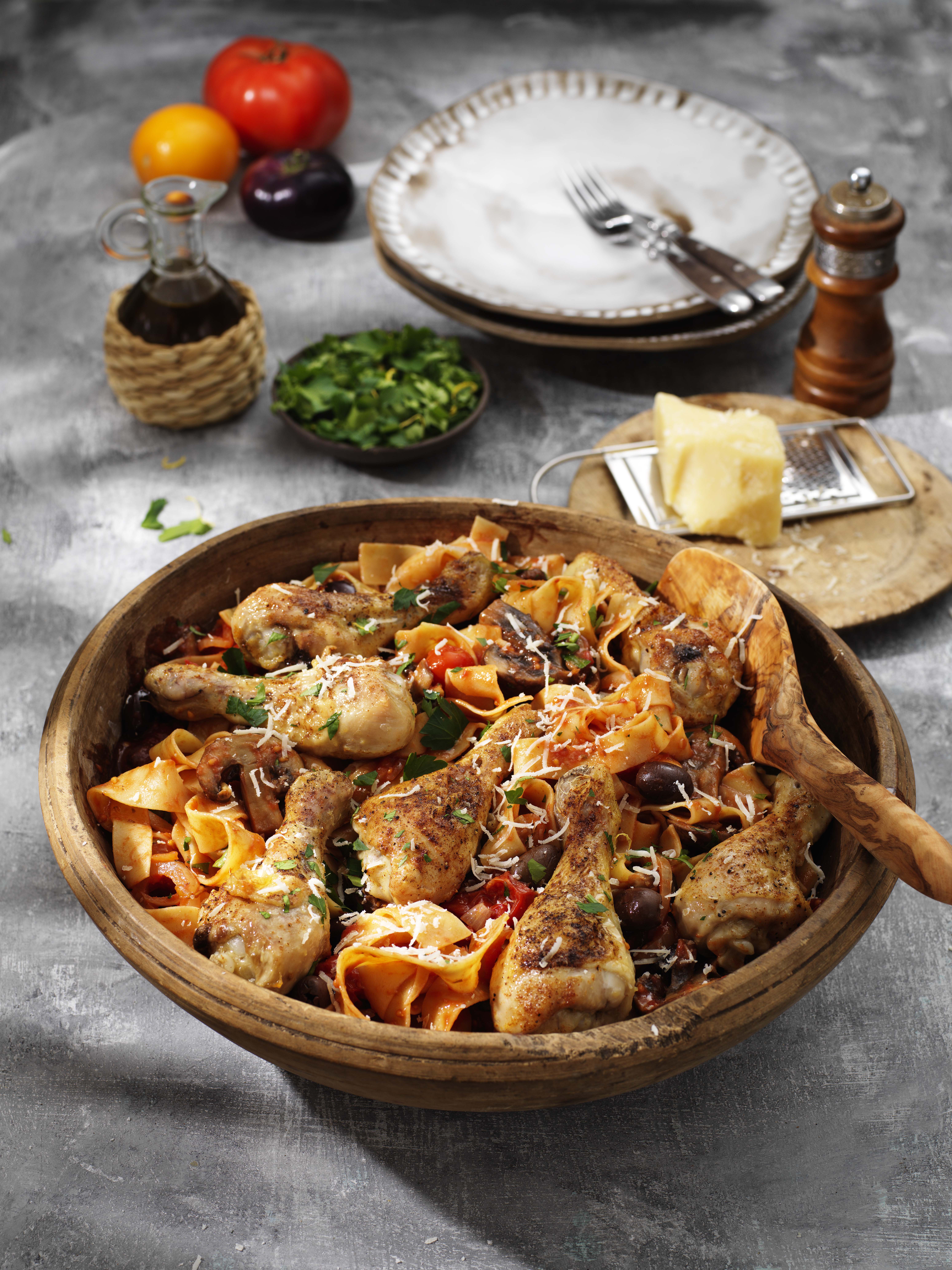 Kycklinggryta – Cacciatore. Klassiskt italienskt långkok som serveras med pasta och namnet betyder ”på jägarens vis”. Kycklinggrytan får sin mustiga smak från lök, tomat, örter och svamp. Vi rekommenderar äggpasta Pappardelle eller Tagliatelle för bästa smakupplevelse.