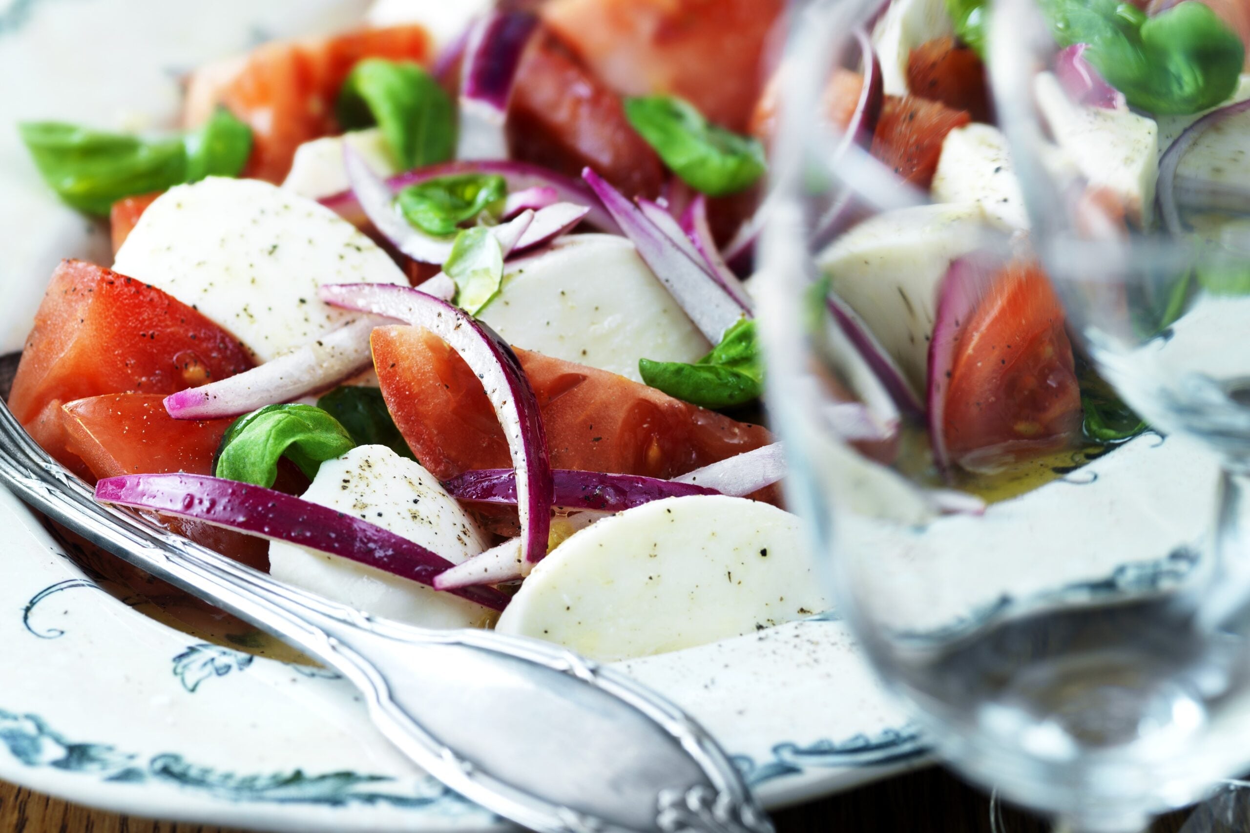 Tomat, mozzarella, rödlök och basilika som marineras tillsammans i en vinägrett. En variant på en klassisk italiensk Caprese.