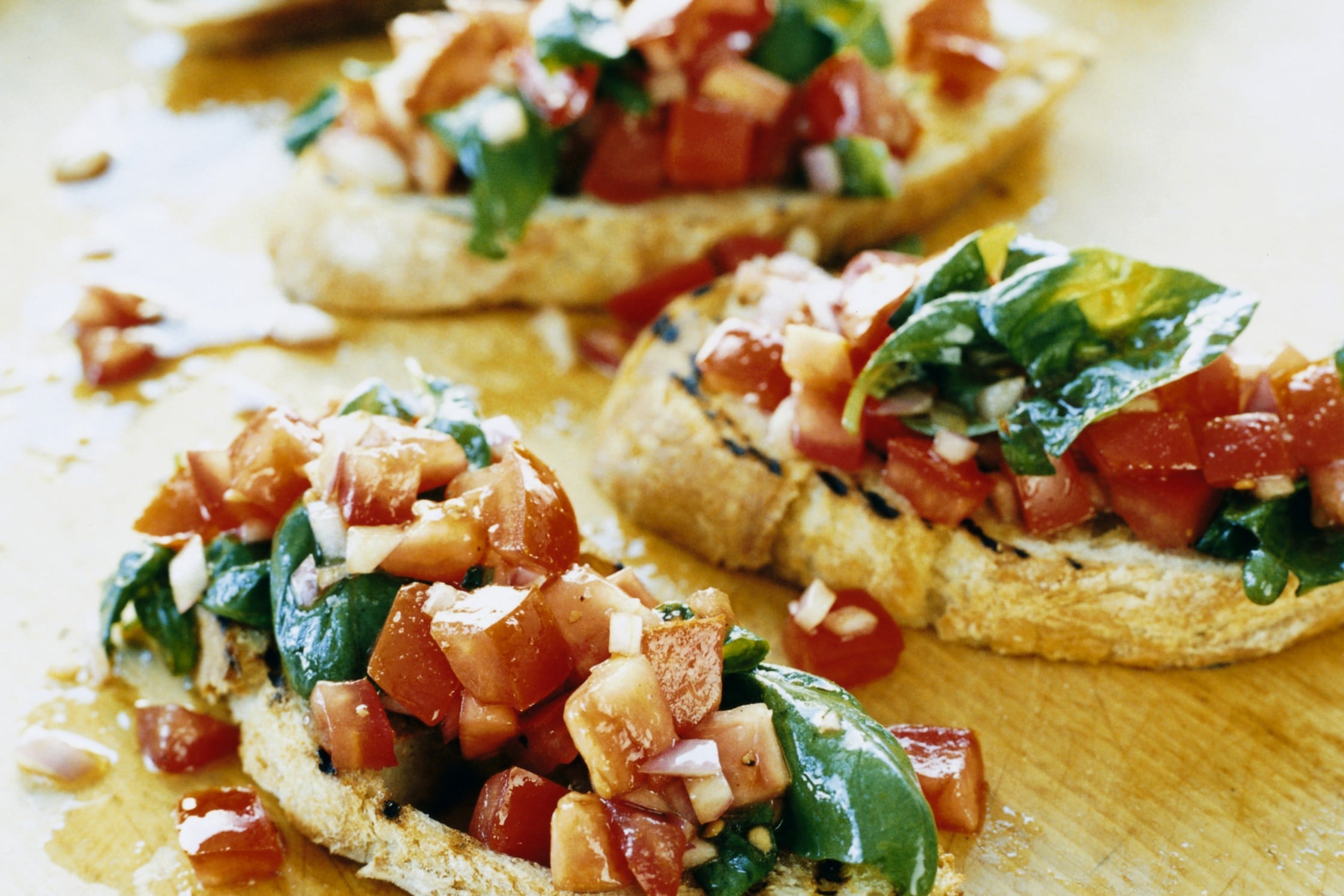Ett grillat italienskt lantbröd med söta, hackade tomater, rödlök och örter.