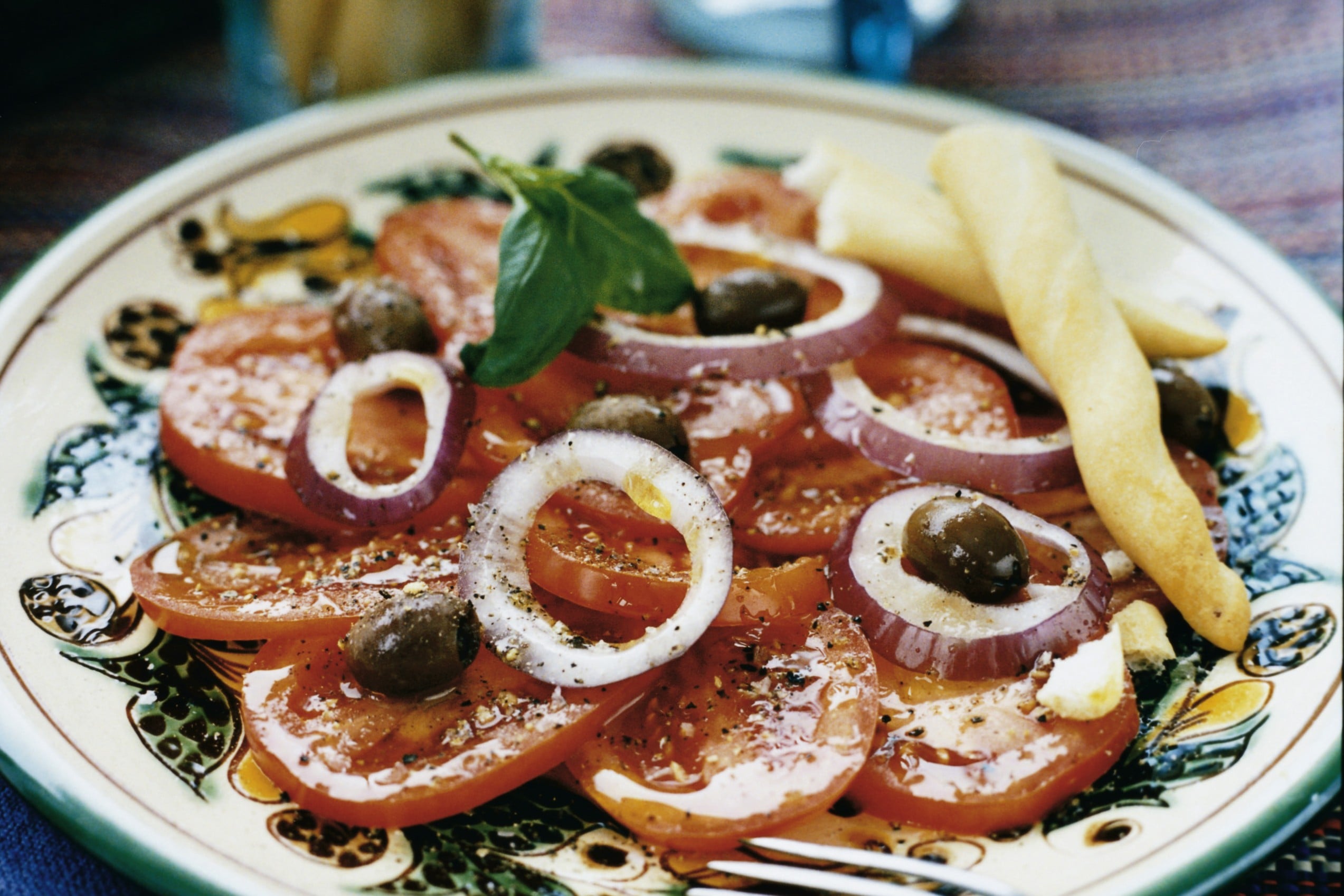 Lägg gärna upp tomatskivorna på ett fint fat, lägg på lökringar och oliver och häll över vinägretten.