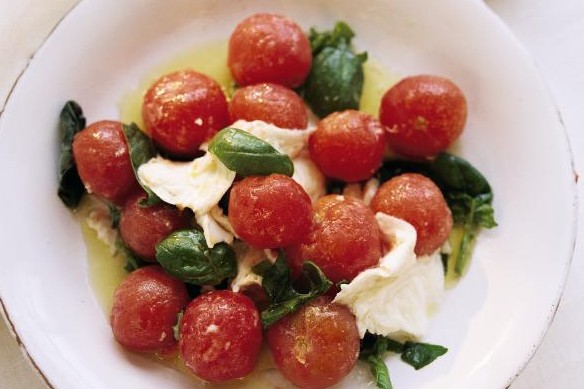 Klassisk tomatsallad med mozzarella och basilika. Tomaterna får en intensiv smak när de doppas i kokande vatten och skalas.