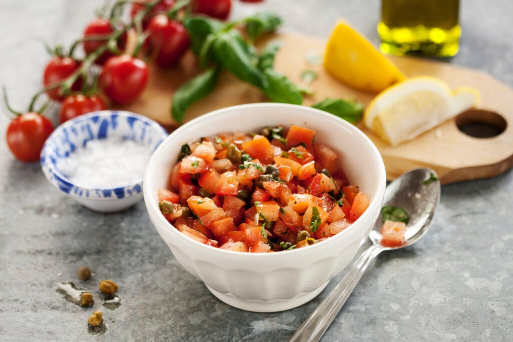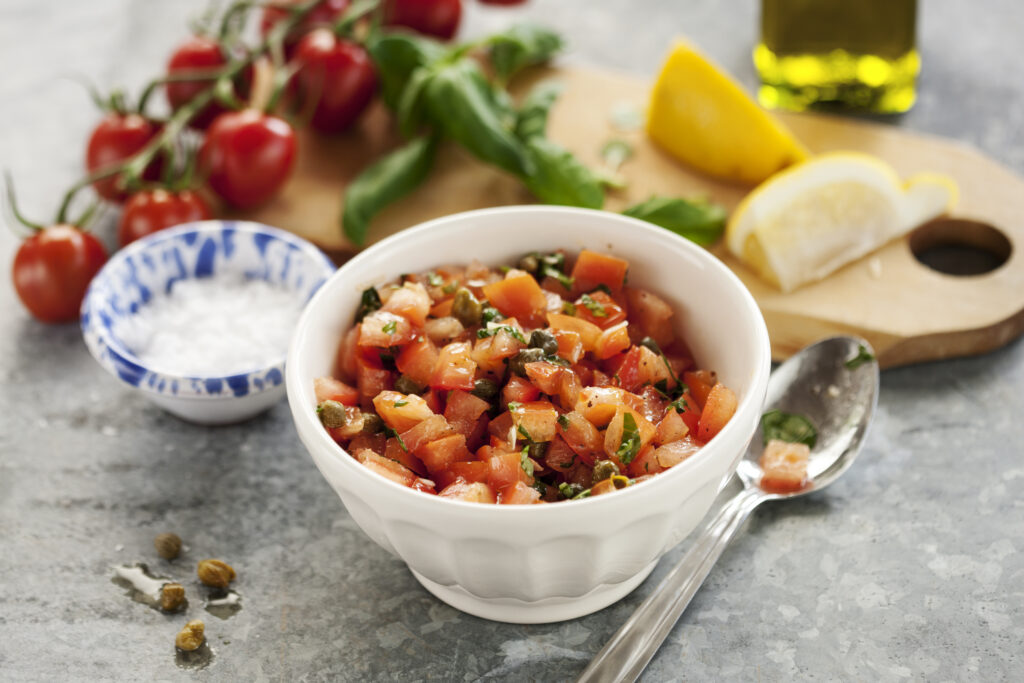 Tomatsalsa på klassiskt italienskt vis med tomater, olivolja, vitlök, kapris och basilika. Enkel och snabb att tillaga.
