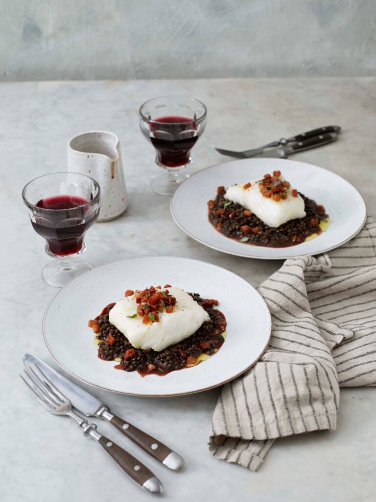 Torskrygg med knaperstekt guanciale och rödvinssås