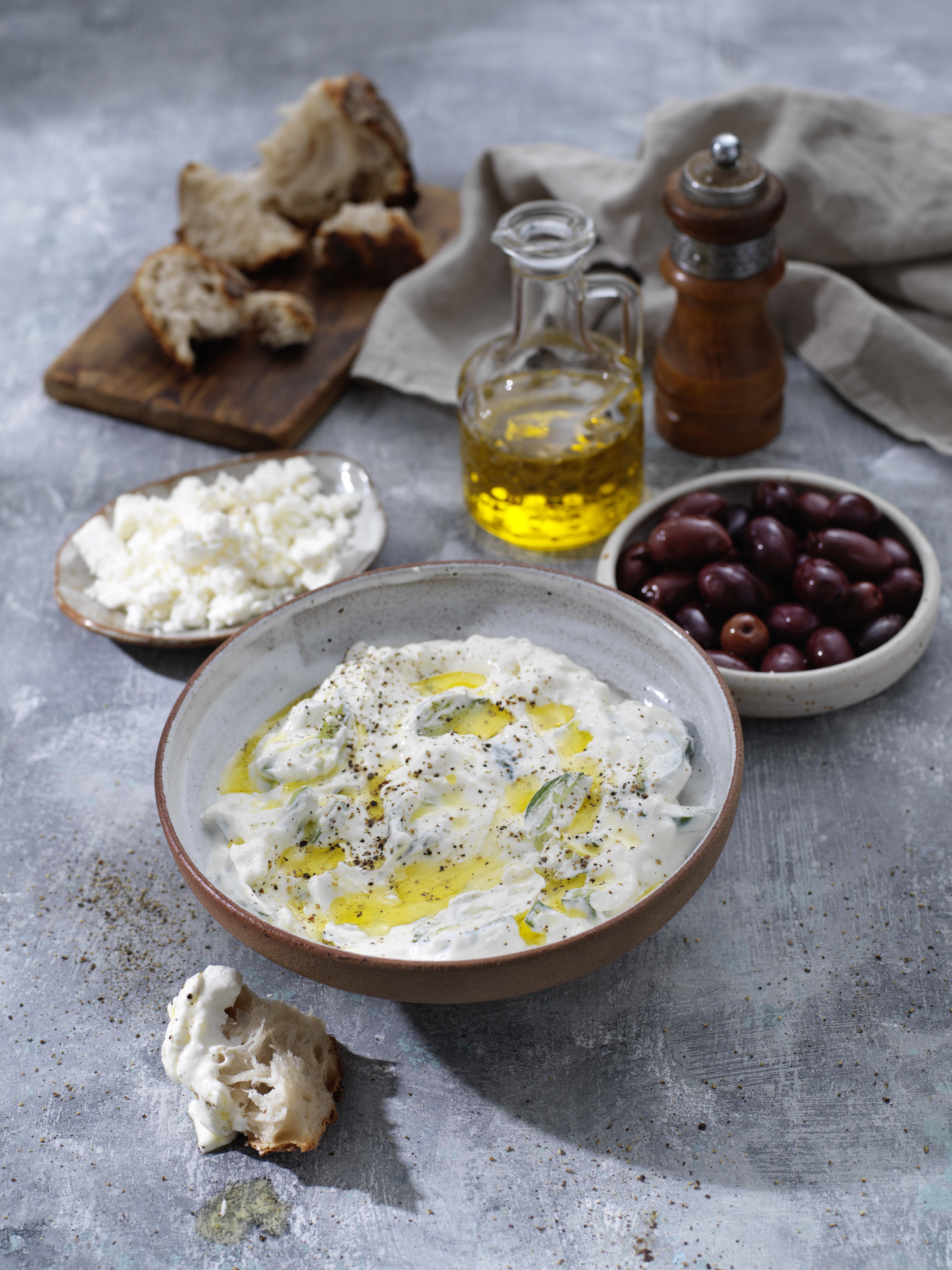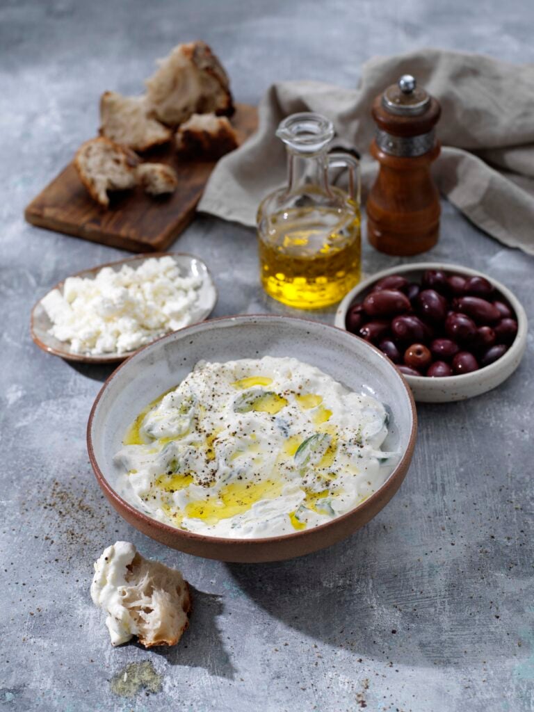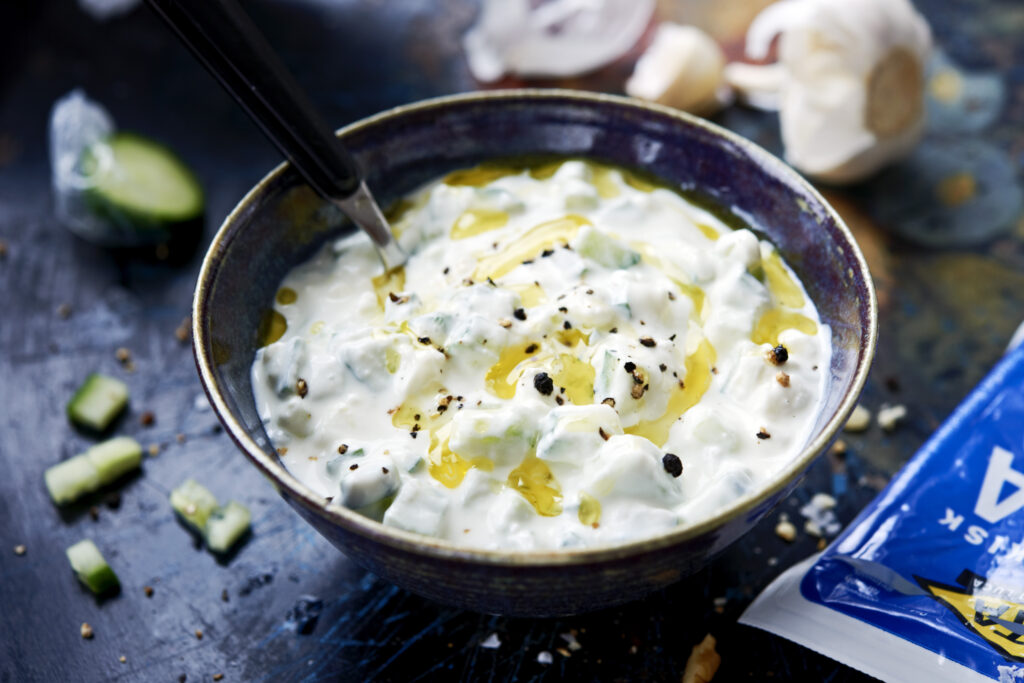 Tzatziki med krispiga bitar av gurka och krämig fetaost. En twist på den grekiska yoghurtsåsen som ofta förekommer i svenska hushåll i samband med grillat, men är lika god att servera till nybakat bröd.
