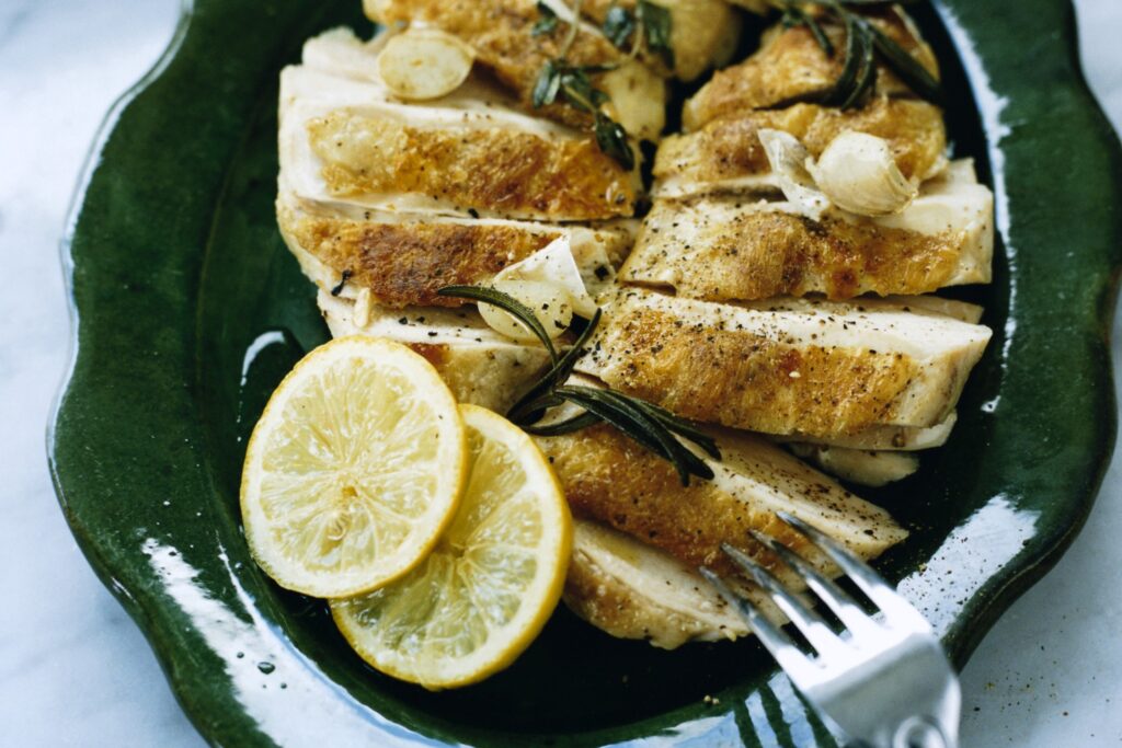 Confitera kycklingen – långkoka den i ugnen – då blir den mör och saftig!