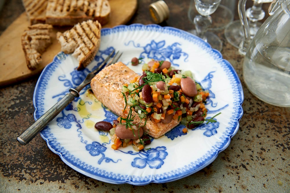 Ugnsbakad lax med italiensk grönsaksröra, soffritto som vänds ner med blandade bönor och persilja. Perfekt snabblagad vardagsmiddag.