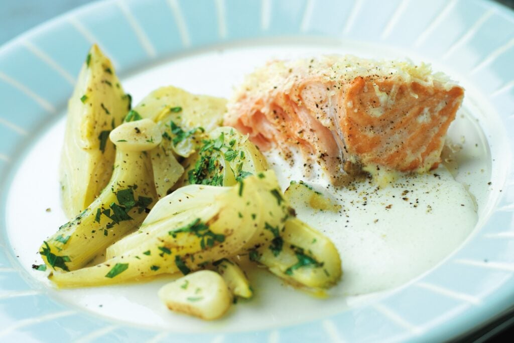 Ugnsbakad lax med fin vinbräserad fänkål och parmesansås. Passar såväl till vardag som fest.