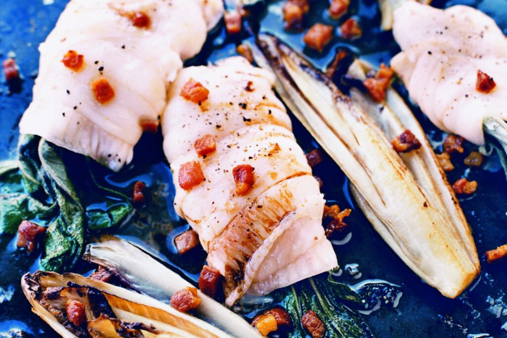 Spättafiléer som tillagas i ugnen med ljuvlig smak av färsk salvia och den goda sältan från pancetta. Serveras med pannrostade endiver.