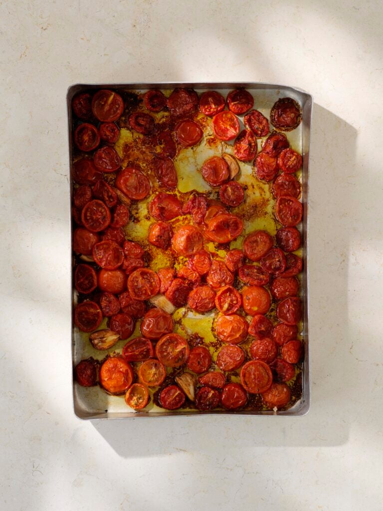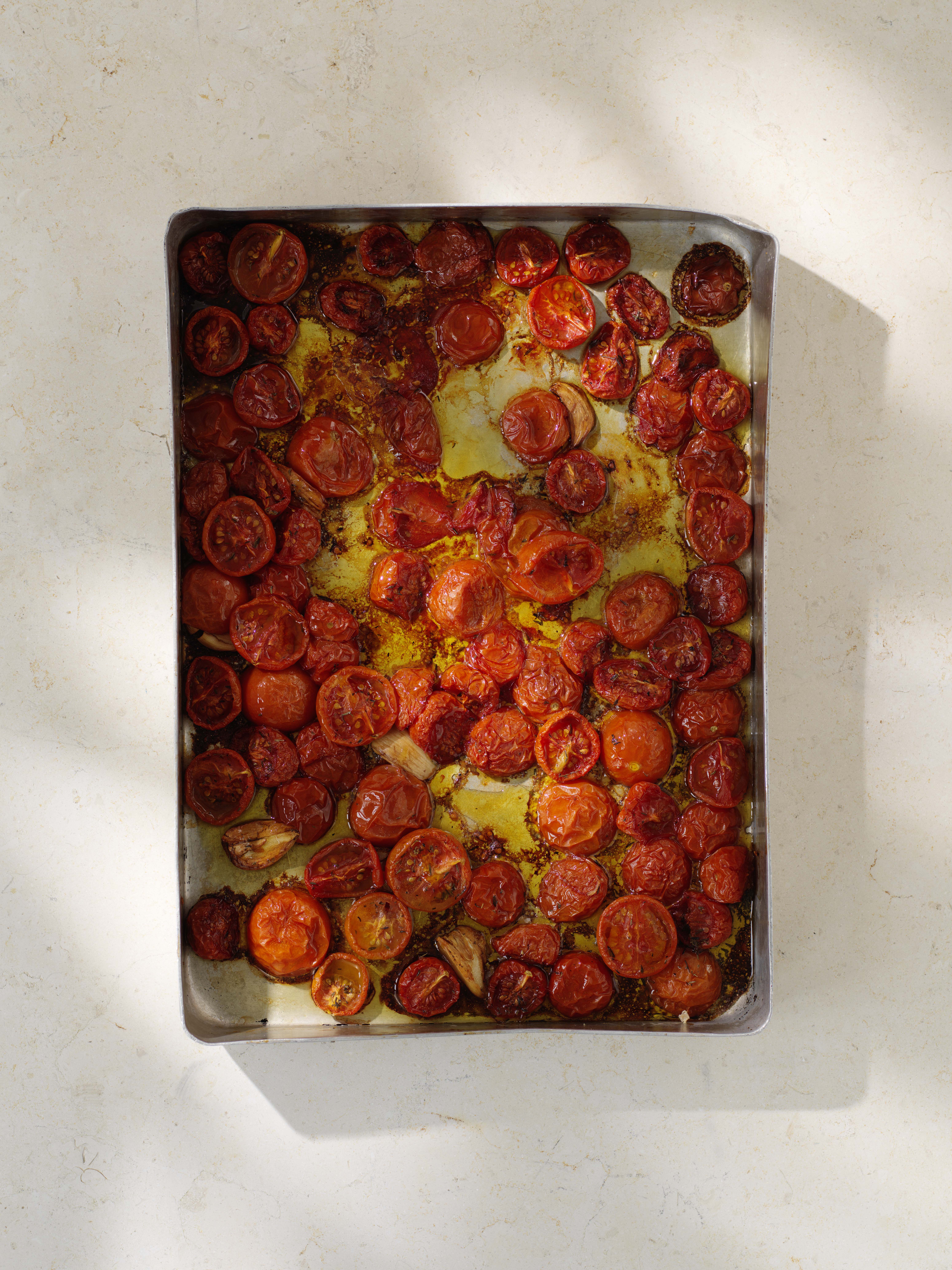 Semitorkade tomater som bakas på låg temperatur i ugnen tillsammans med olja, kan användas till så mycket i köket. Servera tillsammans med burrata och några blad basilika, toppa en pasta eller risotto med dem, fyll i en ciabatta tillsammans med prosciutto eller blanda i en god potatissallad till sommarens grillmiddagar.