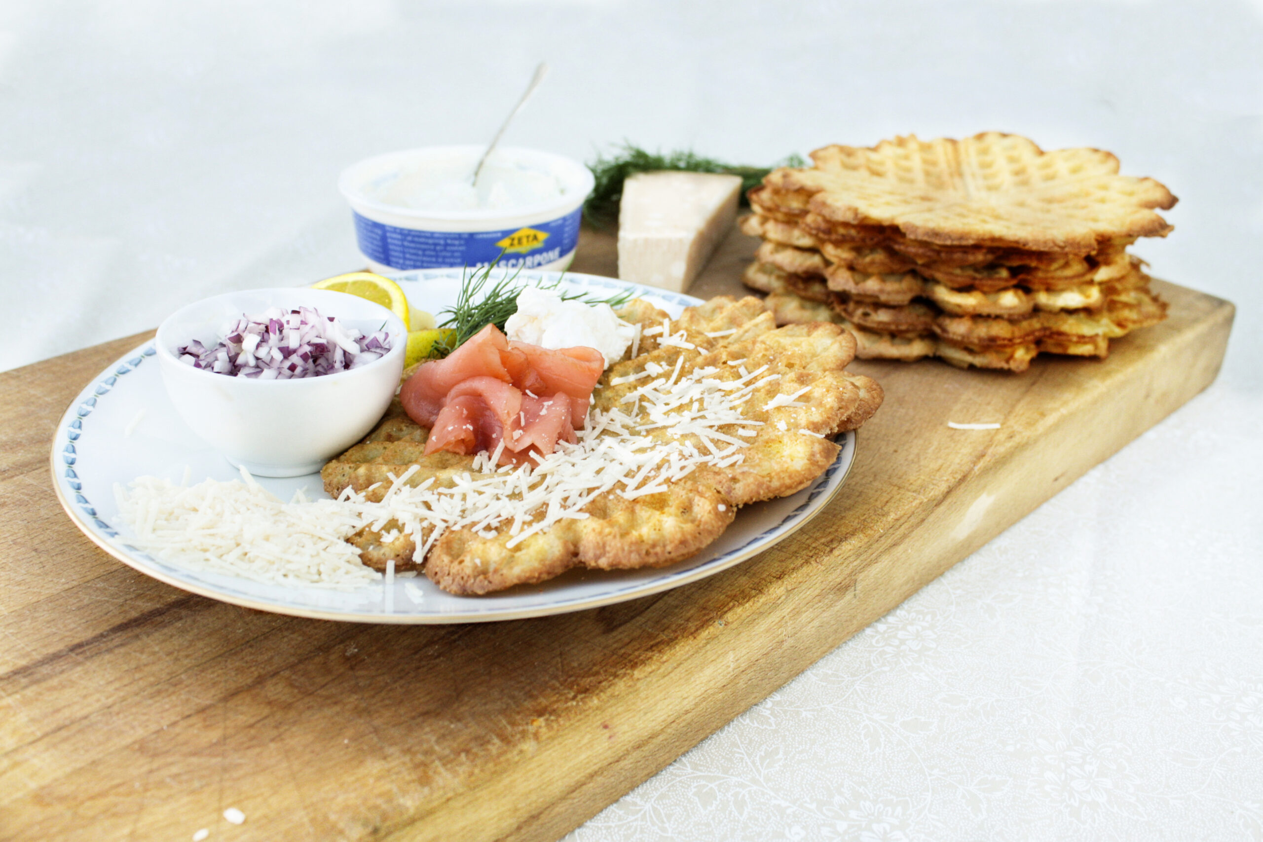 Matiga våfflor med lax, mascarpone och riven parmesan.