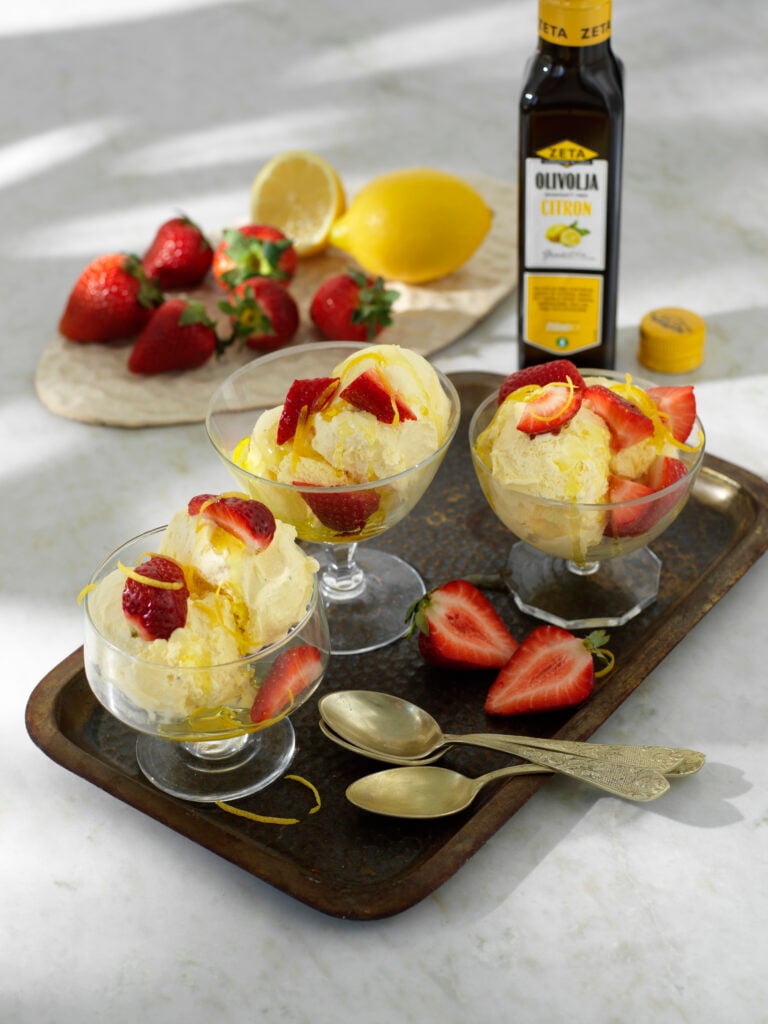 Världens snabbaste och enklaste efterrätt! Vi på Zetas provkök blir lika positivt överraskade varje gång vi äter olivolja ringlad över glass. Hur kan något så snabbt och enkelt kännas så lyxigt? Nu när vi börjat använda Zetas olivolja med citronsmak får vi sött och fräsht i samma munsbit. Så gott!
