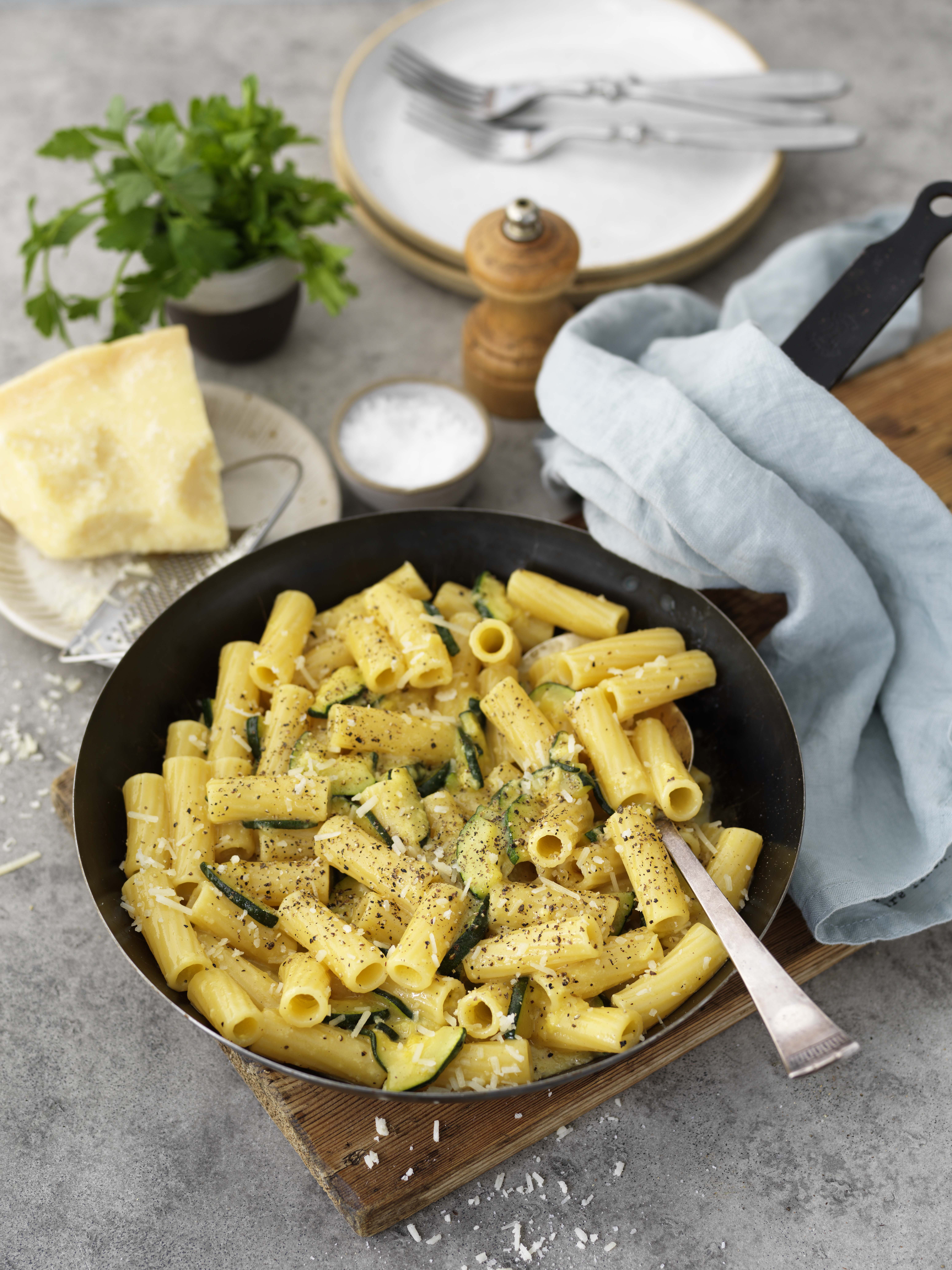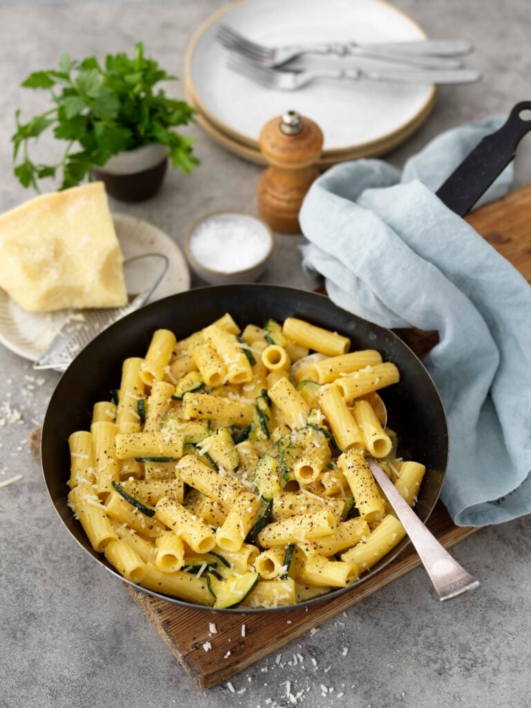 Vegetarisk pasta carbonara med zucchini och parmesan. Enkel och snabblagad vardagspasta som är en italiensk klassiker och förekommer minst en gång i veckan på matbordet hos varje familj i Italien.