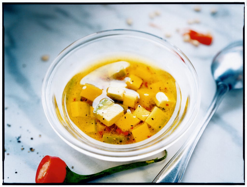 En fruktig vinägrett med mild avokado, het chili och söt mango.