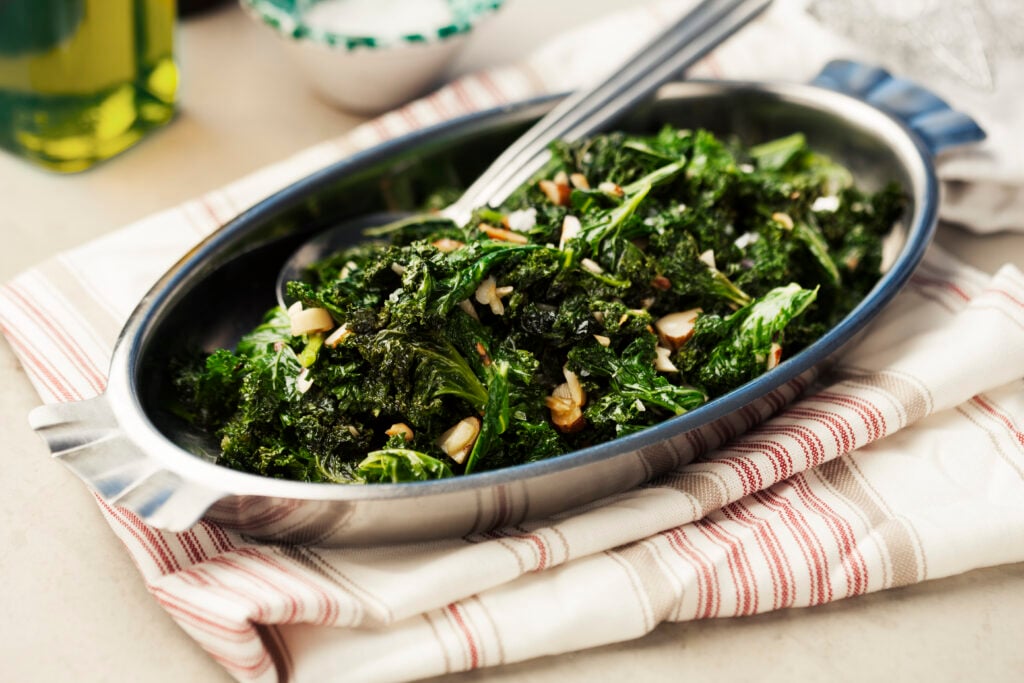 Grönkål fräst i rikligt med en god olivolja smaksatt med vitlök.