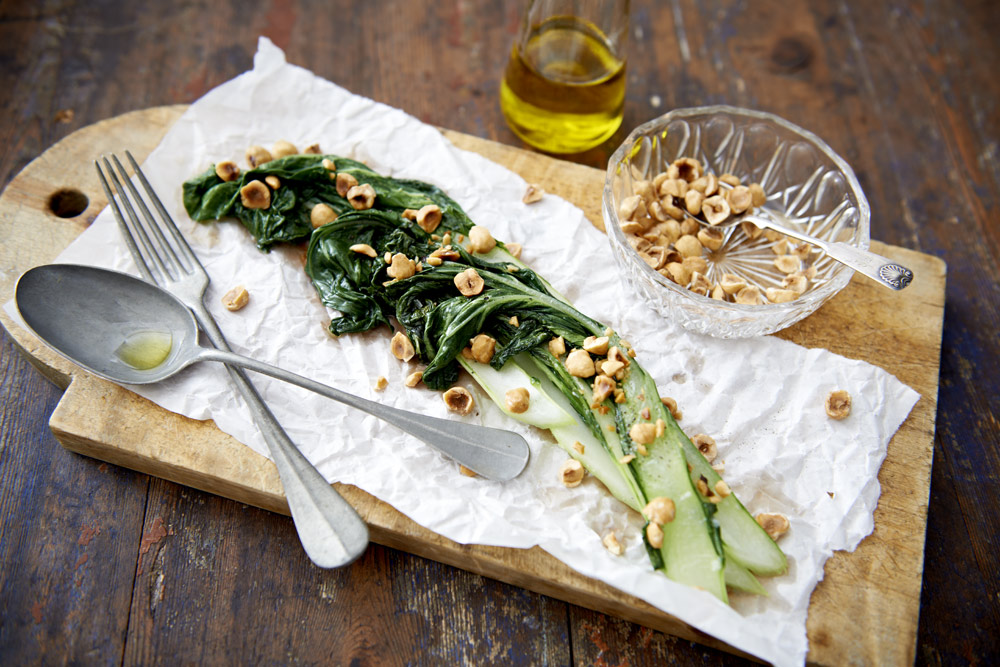 Mangold med vitlök och rostade nötter. Gott tillbehör till fisk eller fläskkött.