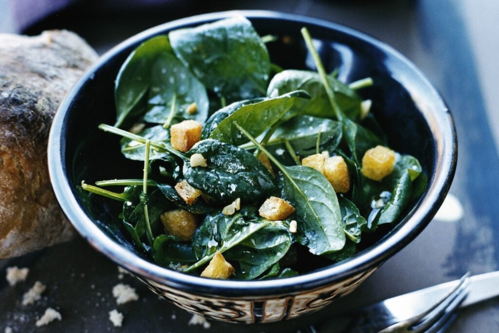 Spenaten får en härlig smak och doft när den fräses tillsammans med vitlök i olivolja. Toppas med krispiga krutonger.