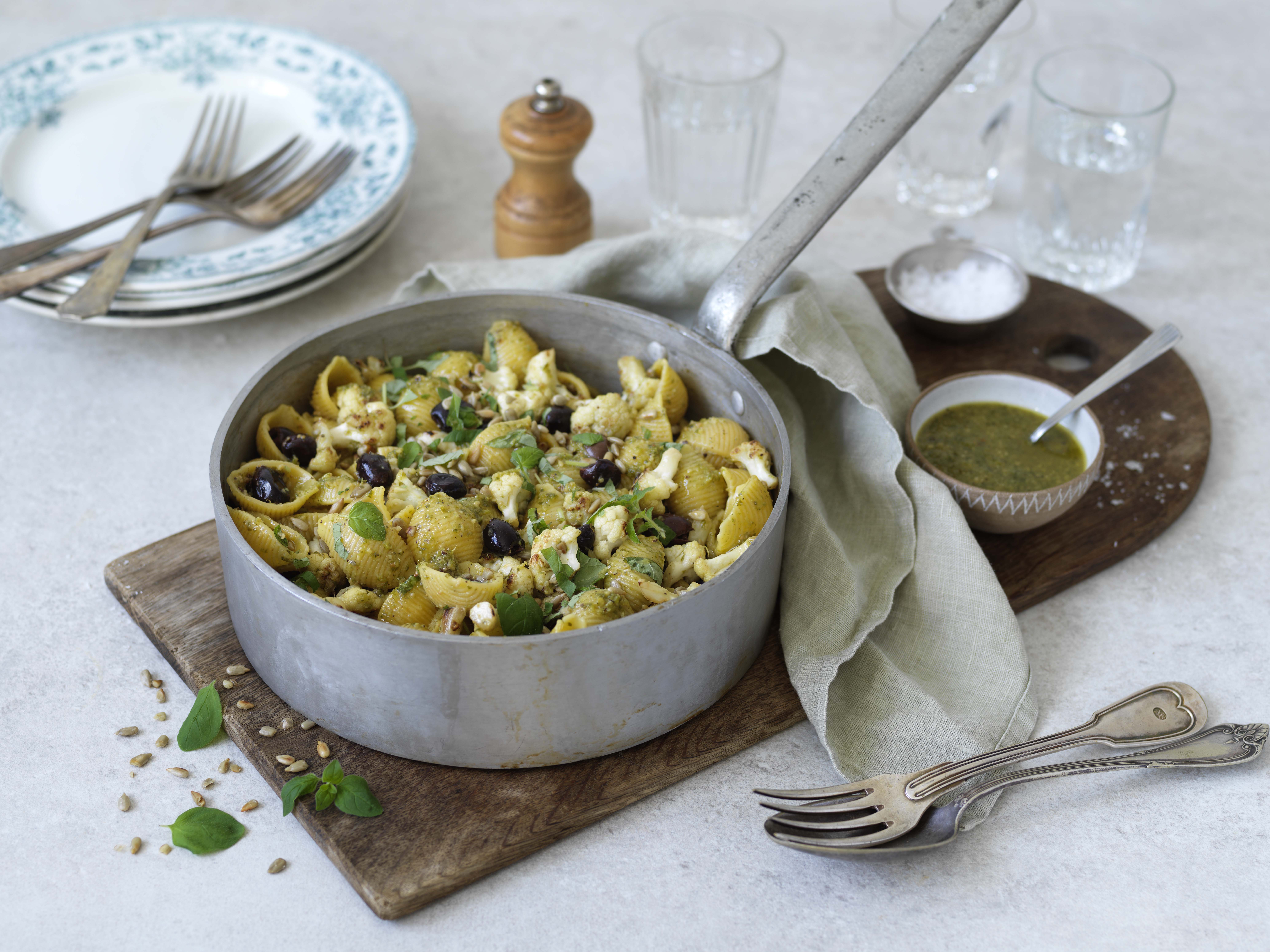 Snabblagad vegetarisk pasta med pesto och blomkål. Utmärkt att servera till vardags när man vill ta vara på trötta grönsaker och kryddor i kylen.